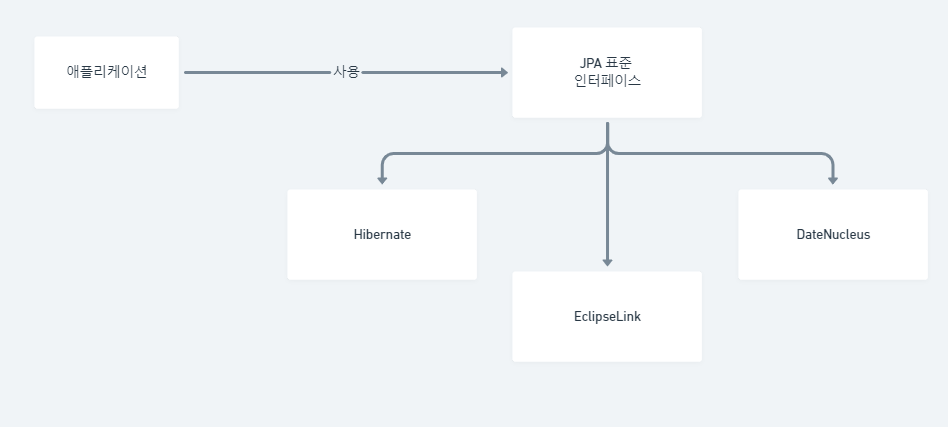 그림을 보자 JPA는 자바 ORM 기술에 대한 API 표준 명세이다. JPA를 사용하려면 JPA를 구현한 ORM 프레임워크를 선택해야 한다. 현재 JPA 2.1을 구현한 ORM 프레임워크는 하이버네이트가 가장 대중적이다.
