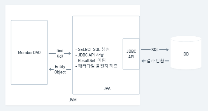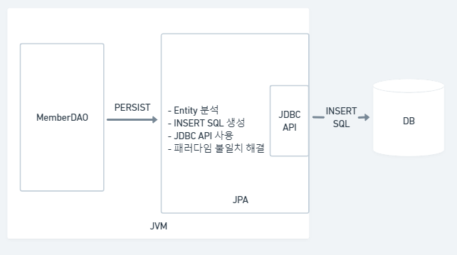 JPA를 사용하면 다음 코드처럼 자바 컬렉션에 자바를 저장하듯이 JPA에게 저장할 객체를 전달하면 된다. INSERT SQL을 작성하고 JDBC API를 사용하는 지루하고 반복적인 일은 JPA가 대신 처리해준다.