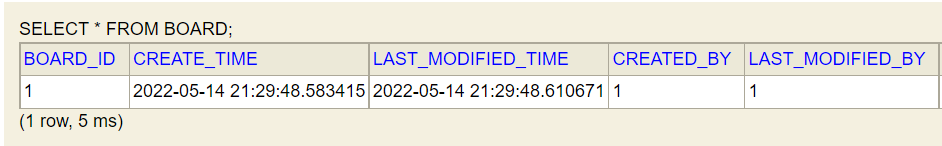 각 CreatedBy와 LastModifiedBy에는 사용자의 식별값(PK)이 들어갈 예정이다. 그럼 테스트 결과를 보자