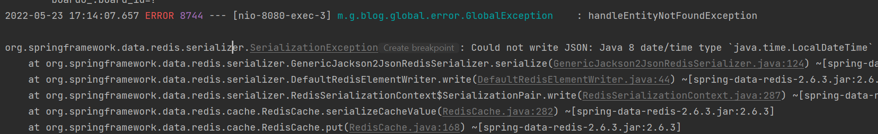 org.springframework.data.redis.serializer.SerializationException: Could not write JSON: Java 8 date/time type `java.time.LocalDateTime` not supported by default: add Module "com.fasterxml.jackson.datatype:jackson-datatype-jsr310" to enable handling (through reference chain: me.golf.blog.domain.board.dto.BoardDTO["lastModifiedAt"]); nested exception is com.fasterxml.jackson.databind.exc.InvalidDefinitionException: Java 8 date/time type `java.time.LocalDateTime` not supported by default: add Module "com.fasterxml.jackson.datatype:jackson-datatype-jsr310" to enable handling (through reference chain: me.golf.blog.domain.board.dto.BoardDTO["lastModifiedAt"])