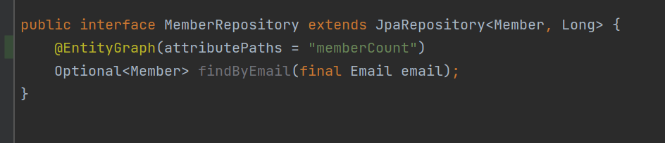 정말 보기 불편한 상황이다. MemberCount를 Join을 해서 가져올 수 도 있는 상황인데 굳이 select쿼리가 두 번이나 나가 성능을 떨어트리고 있다. 이를 해결하기 위해 필자는 @EntityGraph를 사용했다. @EntityGraph는 서로 연관된 엔티티를 JPA가 불러올 때 어떻게 불러올 것인지를 비교적 유연하게 (fetch = Lazy or EAGER 선언 시 정적이므로 런타임 중에는 변경 하지 못한다.) 표현하기 위해 사용한다.