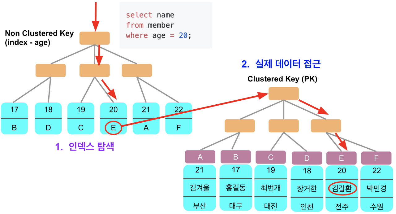 정렬된 상태로 위와 같은 속도로 빠르게 접근하여 데이터를 찾은 후 실제 데이터에 접근하여 인덱스 테이블에서 찾은 정보와 일치하는 데이터들만 가져오므로 매우 빠르게 데이터를 찾아올 수 있다.