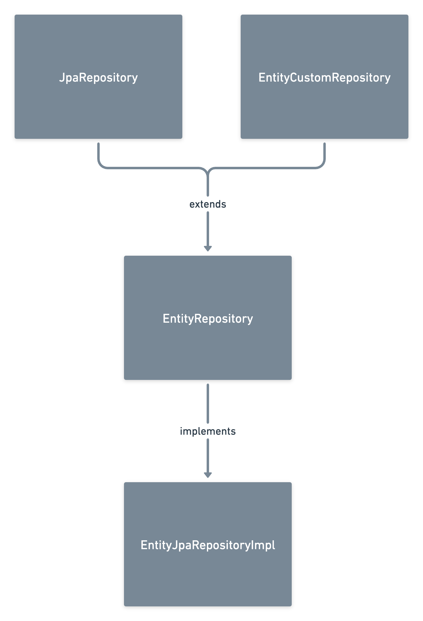 interface간의 extends는 확장의 개념으로 생각하면 편하다. JpaRepository와 CustomRepository를 상속받아 구현체들을 확장시켜 EntityRepository를 하나의 추상화된 Repository로 만들었다. 이제 이렇게 되면 구현체인 SimpleJpaRepository와 CustomRepositoryImpl의 구현체가 되는 것이다. 이를 이용하여 우린 결국 엔티티에 대한 저장소만 알면 나머지 구체적인건 추상화된 EntityRepository만 알면 사용가능하다.