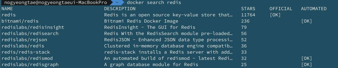 docker search {image명} 을 이용하여 검색해보면 OFFICIAL에 [OK] 라고 붙은 이미지를 볼 수 있습니다. 이것이 바로 공식 이미지 입니다.