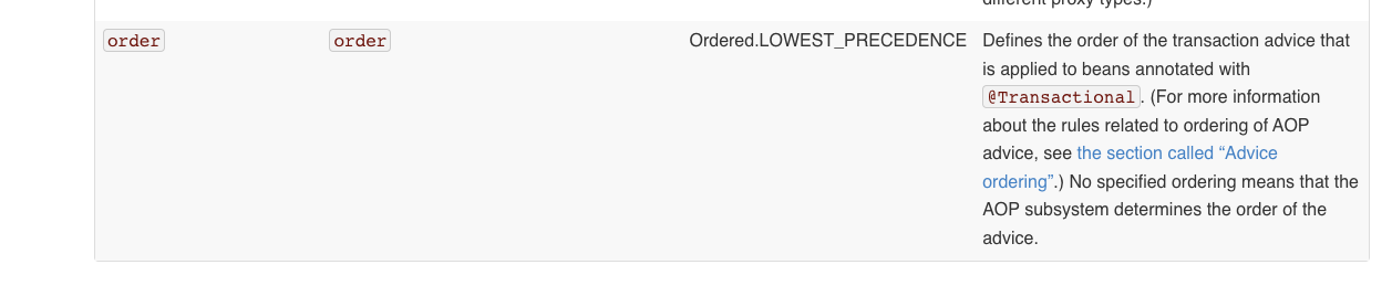 AOP에는 우선순위가 매겨져 있습니다. 그리고 이 설정이 충돌되면 동작하지 않는 경우가 발생하는데 공식문서에서 Transactional의 우선순위는 LOWEST_PRECEDENCE 였습니다.