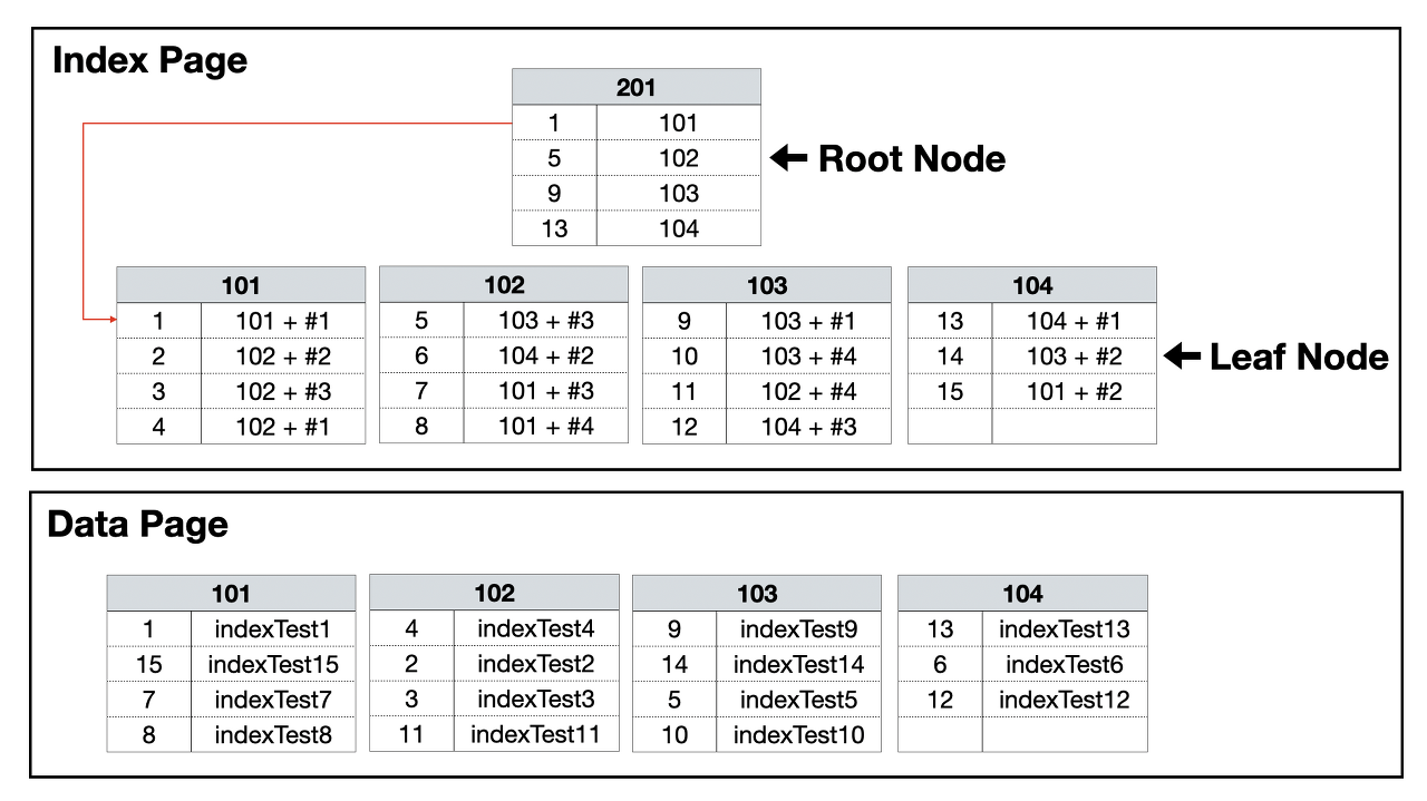 인덱스 페이지는 인덱스 트리의 각 노드에 해당하며, 데이터베이스 시스템은 인덱스 페이지를 사용하여 테이블에서 특정 행을 찾을 수 있습니다. 인덱스 페이지는 키 값에 대한 데이터 위치 정보를 갖고 있기 때문에, 데이터 베이스는 키 값을 인덱스에서 찾은 다음 그 데이터 위치 정보를 활용하여 테이블에서 행을 찾습니다.