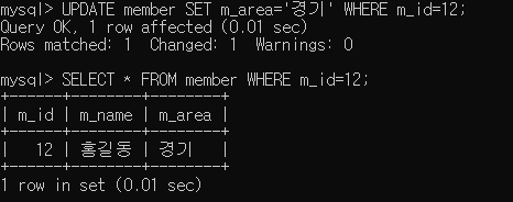 mysql> UPDATE member SET m_area='경기' WHERE m_id=12;
