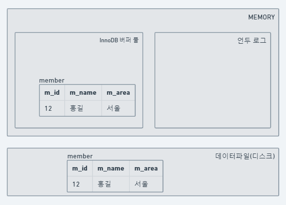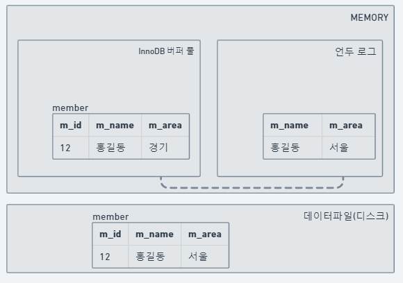 UPDATE 문장이 실행되면 커밋 실행 여부와 관계없이 InnoDB의 버퍼 풀은 새로운 값인 '경기'로 업데이트 된다. 그리고 디스크의 데이터 파일에는 체크 포인트나 InnoDB의 Write 스레드에 의해 새로운 값으로 업데이트돼 있을 수도 있고 아닐 수도 있다.