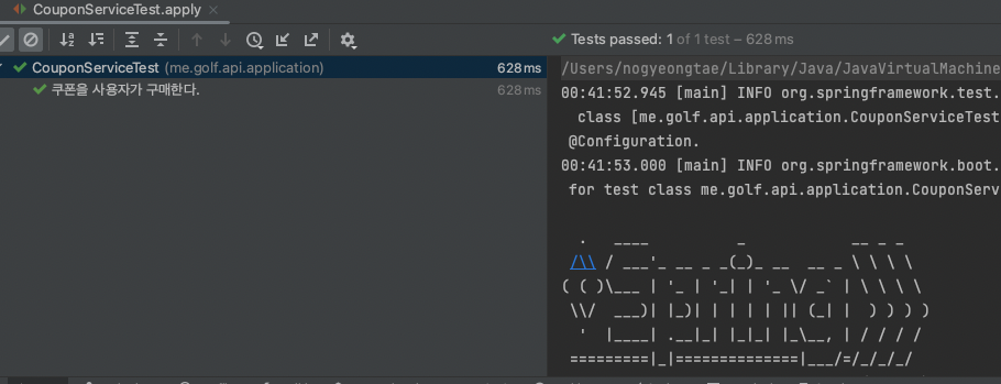 테스트 코드 실행 시 성공하는 것을 볼 수 있습니다.