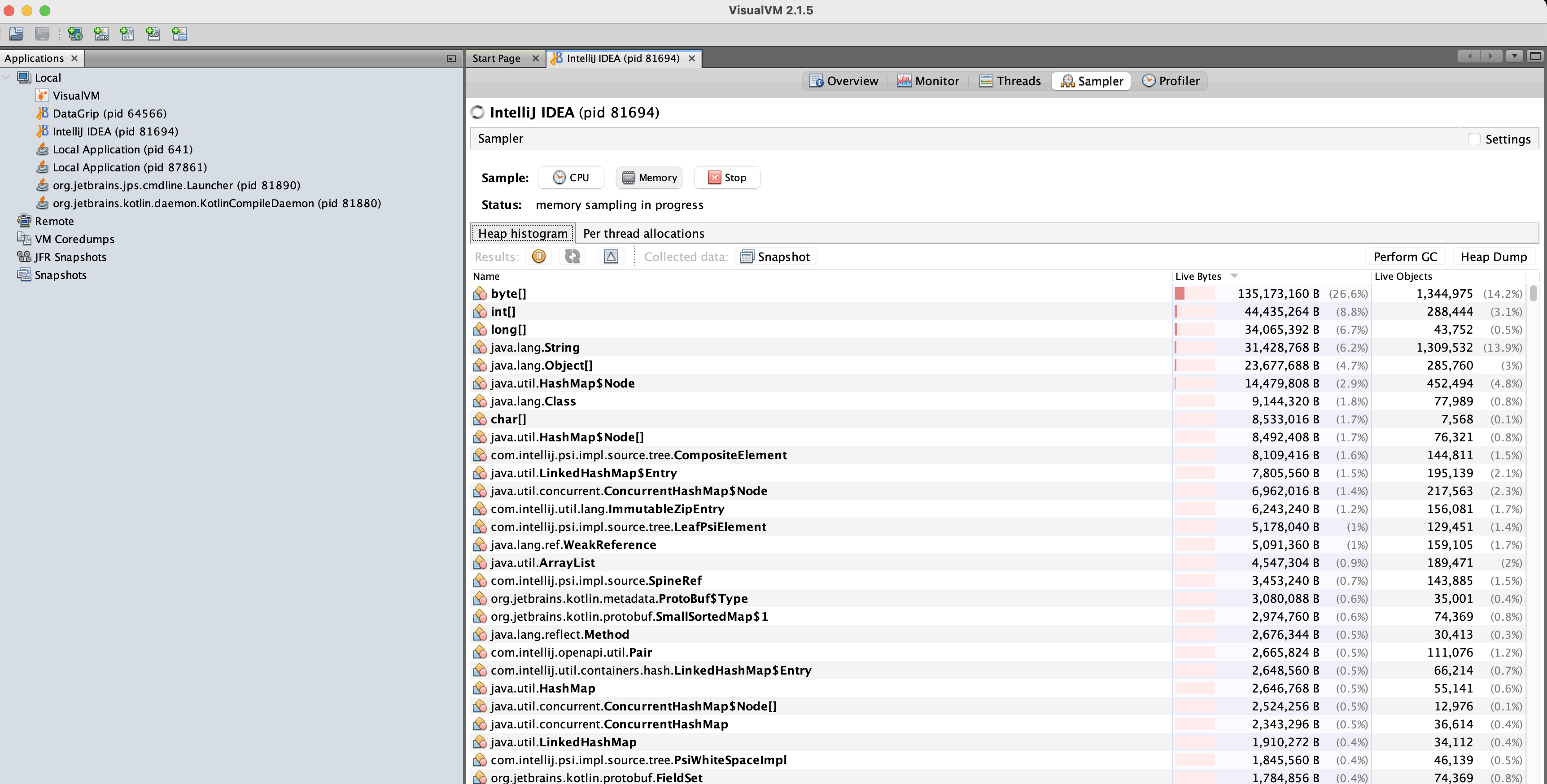 위는 visualVM의 UI 화면입니다. remote 연결도 가능하기 때문에 원격 서버에 heap dump 분석도 가능합니다. 위에 보이는 숫자들이 byte 단위의 용량입니다.