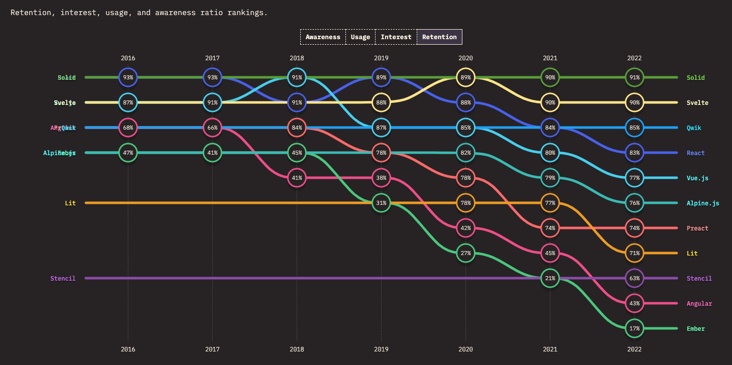 svelte는 UI를 그리기 위한 javascript 기반 framework로 2016년 비교적 최근에 출시되었습니다. 이 framework는 많은 사랑을 받고 있기도 한데요. state Js of 2023 사이트의 자료에 의하면 매우 높은 비율로 흥미를 보이고 있습니다.