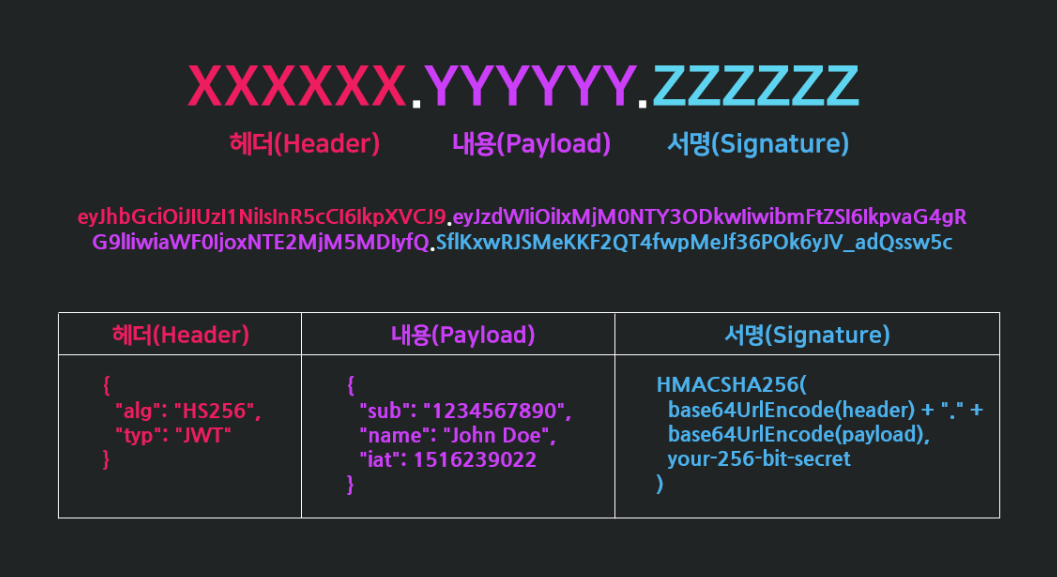 Signature: 헤더와 페이로드를 인코딩한 후, 비밀 키를 사용하여 해상한 값입니다. 이는 토큰의 무결성과 출처를 확인하는 데 사용됩니다.
