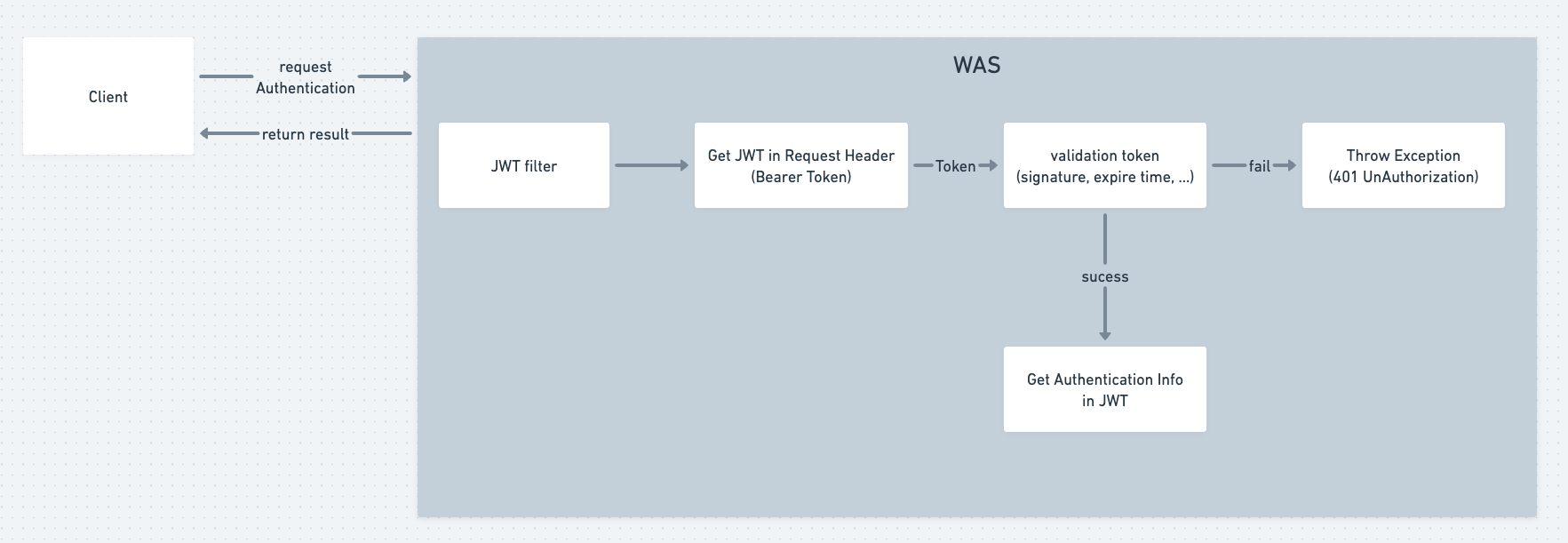1. Client가 JWT 정보를 Request Header에 Authorization Header에 담아 Bearer Token 형태로 WAS에 인증 요청을 보냅니다.