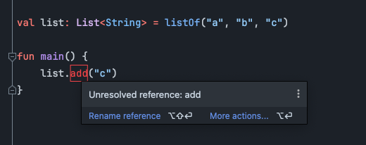다음과 같이 코틀린에선 List 내부의 상태를 변경할 수 없습니다. 철저한 불변이라고 볼 수 있습니다.