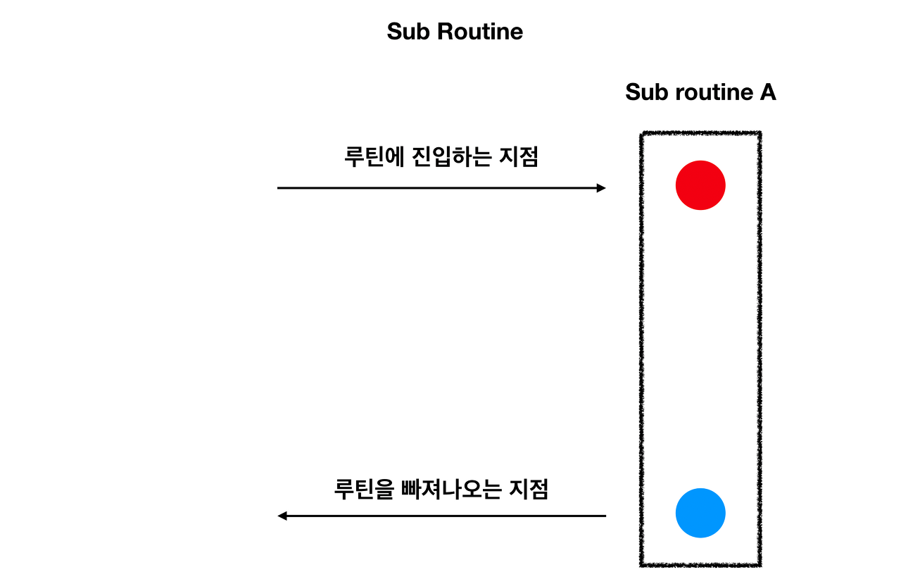 sub routine은 우선 진입과 빠져나오는 지점이 명확합니다. 맨 처음 진입 부터 return문이나 닫는 괄호를 만나면 routine을 빠져나옵니다. 그리고 진입 시 쓰레드는 Block system call 일 경우 다른 작업을 하지 못합니다.