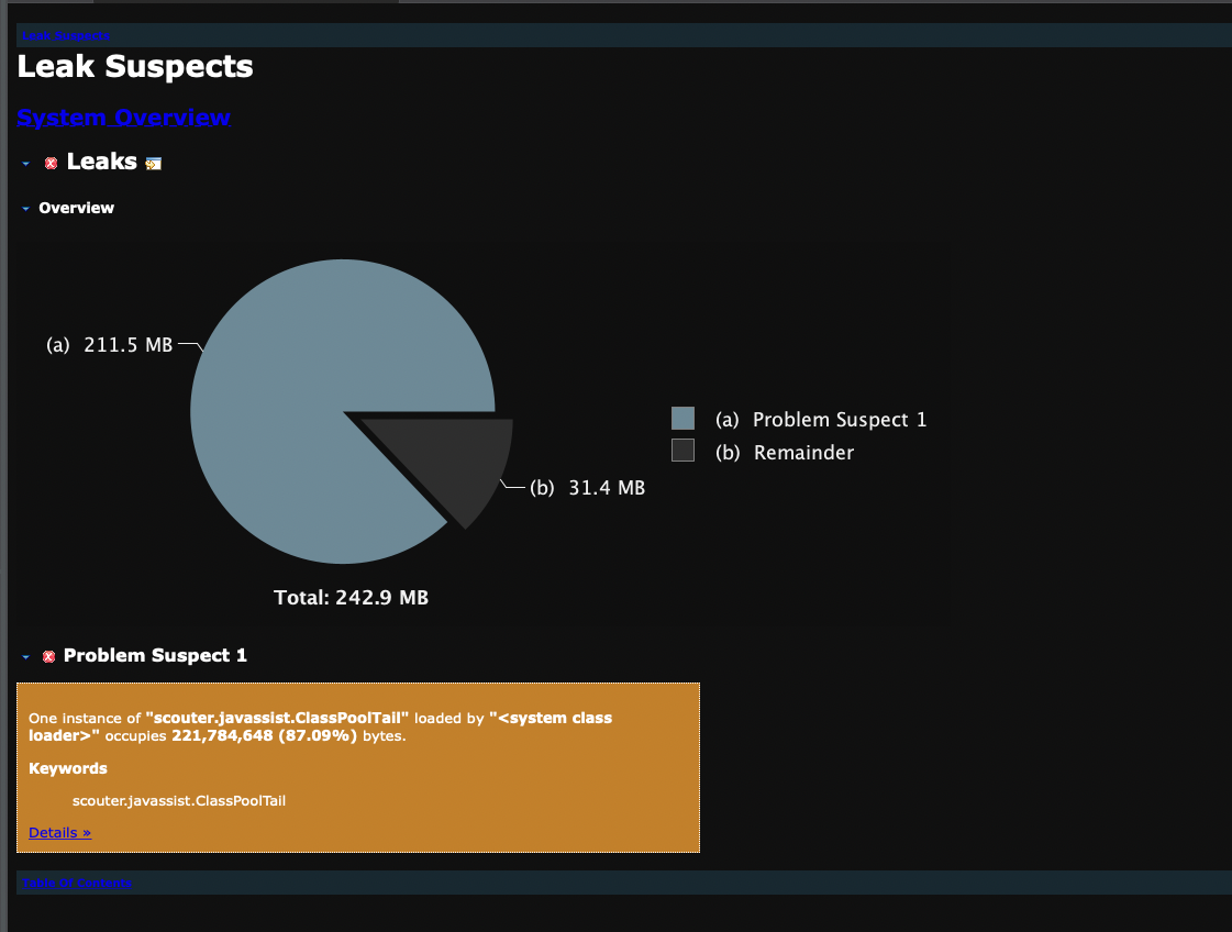해당 사진은 실제 JDK 17과 scouter간에 호환성 문제로 인하여 OOM이 발생한 프로그램을 heap dump를 떠서 분석한 내용입니다. 보면 scouter.javaasist.ClassPoolTail 이라는 객체가 약 87% 이상을 차지하고 있고 이 인스턴스로 인해 OOM이 발생했다고 알려주고 있습니다.