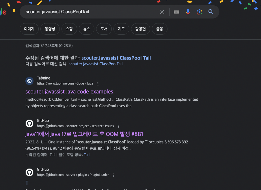구글에 검색해보니 바로 OOM 발생 이슈가 올라와있는 것을 확인할 수 있습니다. (실제로 현재 문제는 이미 scouter 측에서 문제를 해결한 버전을 출시해 놨습니다. scouter 최고 !!)
